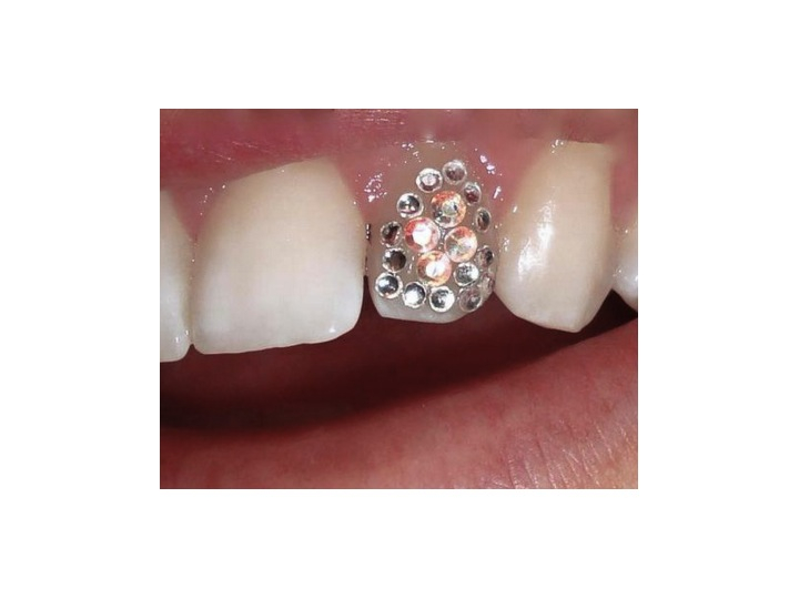 Jewelry on teeth. Our tooth jewelry is made by genuine swarovski crystals that are small in diameter have a flat back platinum surface and are applied to the tooth using safe dental materials. When a jewelry is place it covers the discolored patch or spot. However this gap should not be large enough as the jewelry is highly limitedly small.